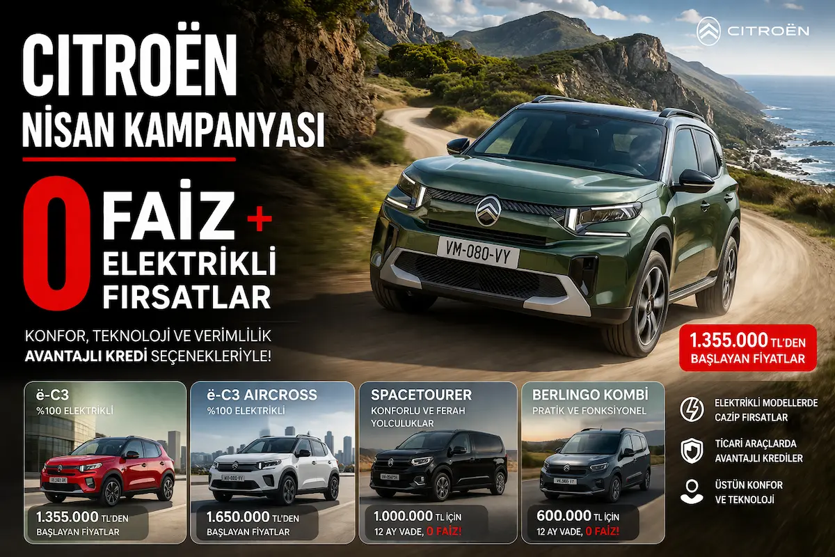 Citroën Nisan kampanyasıyla ë-C3, Aircross ve ticari modellerde 0 faizli kredi fırsatları sunuluyor. Detaylar ve fiyatlar haberimizde.