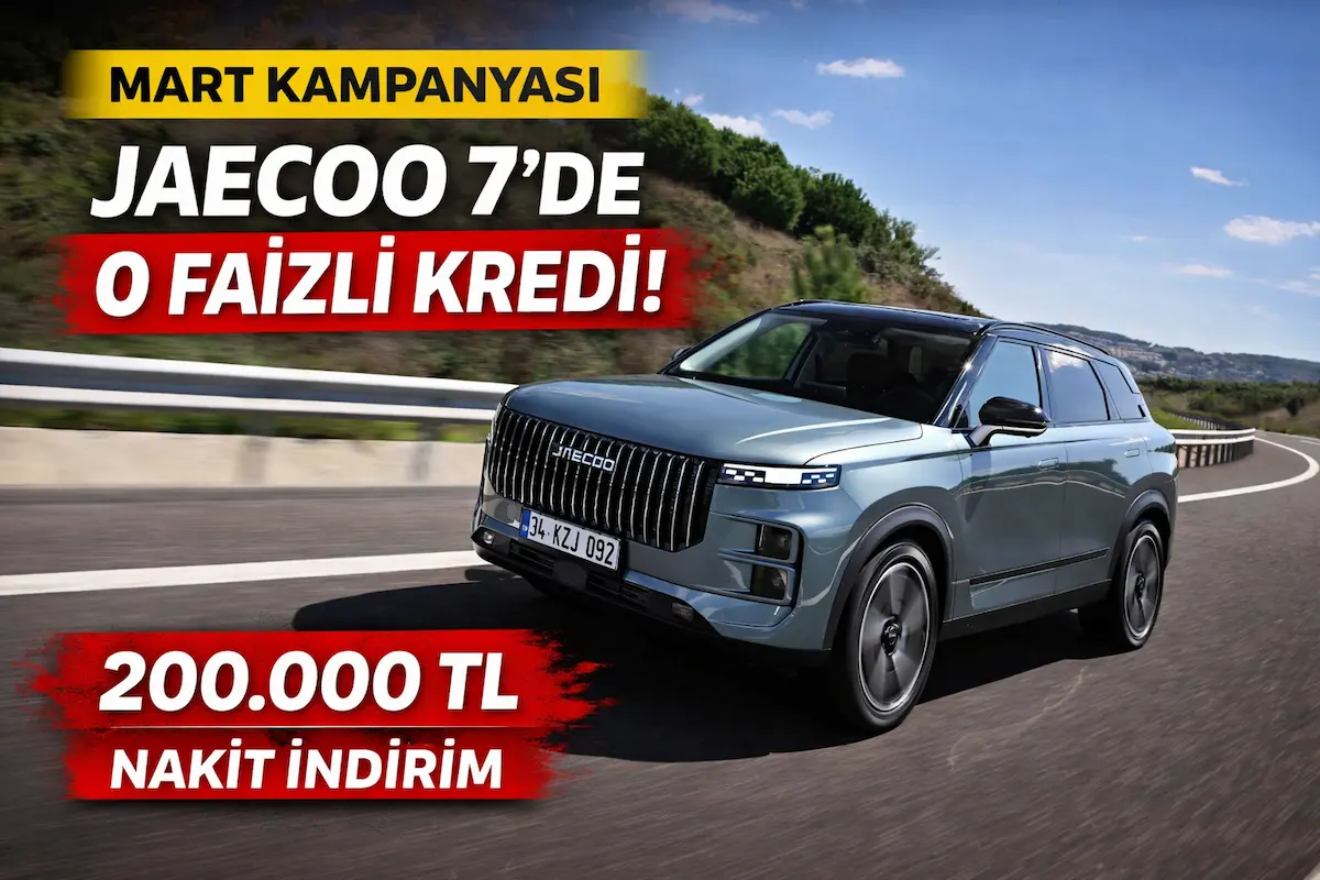 JAECOO 7 için mart ayına özel kredi ve nakit indirim kampanyası açıklandı. Ticari müşterilere 0 faizli kredi ve 200 bin TL’ye varan nakit avantaj sunuluyor.