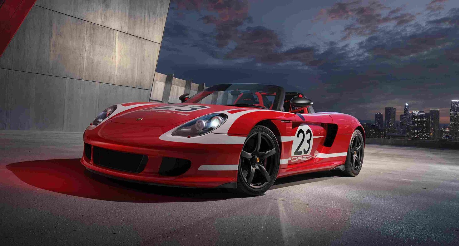 El boyaması Guards Red & beyaz renkler, ikonik 23 numarası ve şeffaf koruyucu filmle kaplanmış, yollarda kullanılabilecek kadar dayanıklı ama sergi otomobili kadar özel bir Carrera GT.