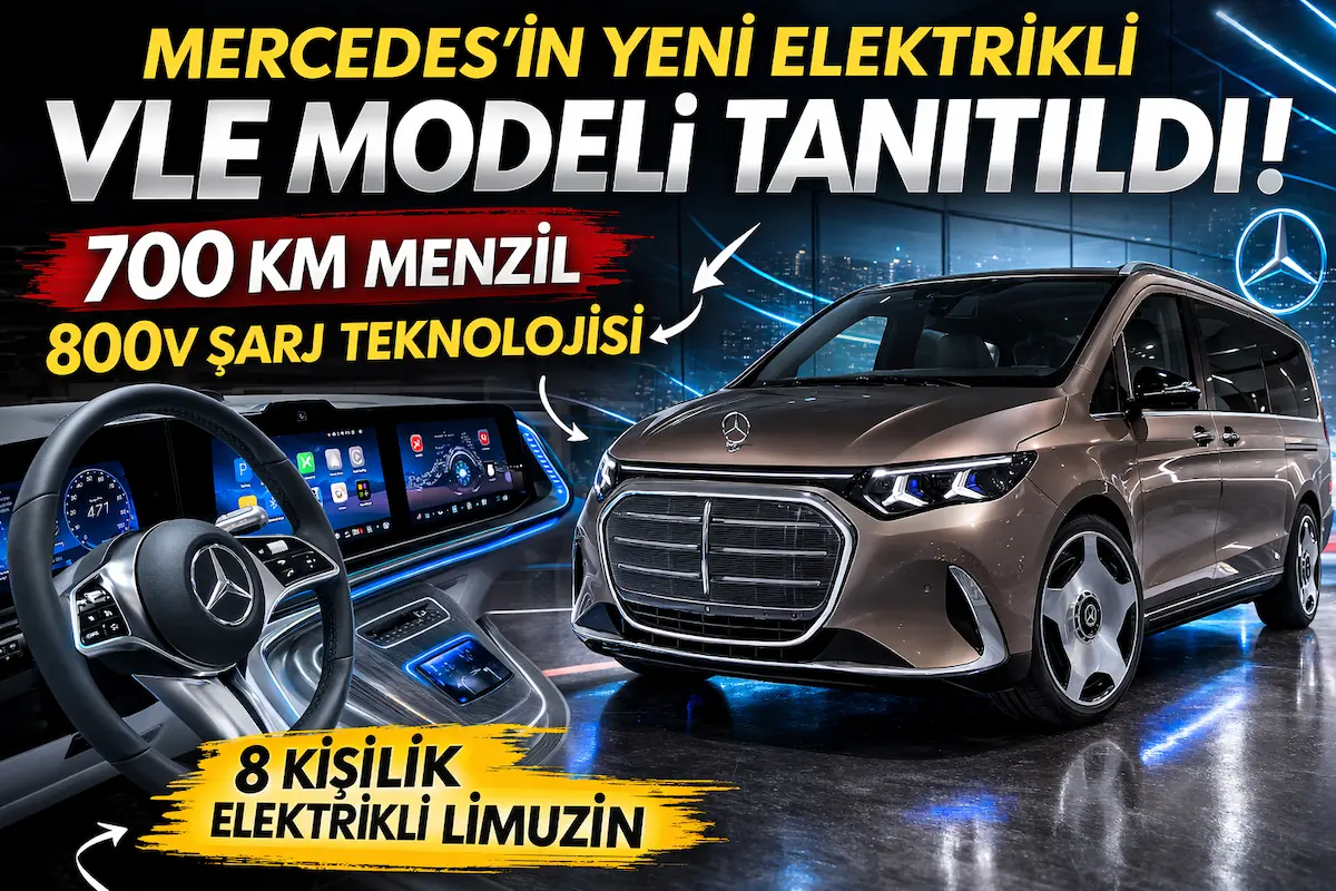 Mercedes-Benz yeni elektrikli VLE modelini tanıttı. 700 km menzil, 800 volt şarj teknolojisi, 8K arka ekran ve 8 kişilik iç mekân dikkat çekiyor.